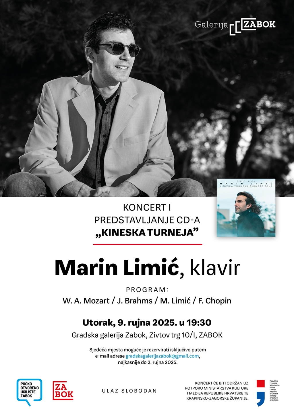 Ulaz na koncert je besplatan, ali je broj sjedećih mjesta u Galeriji ograničen. Ukoliko želite, sjedeća mjesta možete rezervirati isključivo putem e-mail adrese gradskagalerijazabok@gmail.com, najkasnije do 2. rujna 2025.