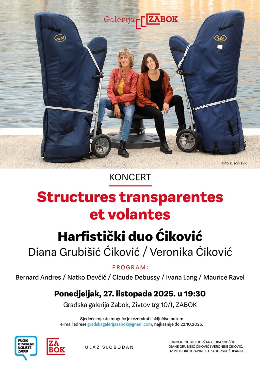 Ulaz na koncert je besplatan, ali je broj sjedećih mjesta u Galeriji ograničen. Ukoliko želite, sjedeća mjesta možete rezervirati isključivo putem e-mail adrese gradskagalerijazabok@gmail.com, najkasnije do 22. listopada 2025.